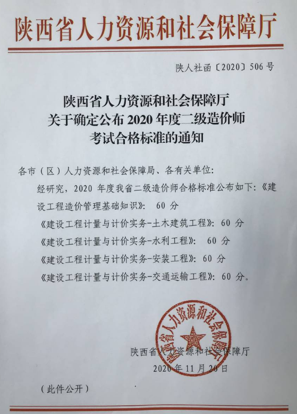 2020年度陜西省二級造價(jià)師職業(yè)資格考試合格標準已經(jīng)發(fā)布,全部科目合格分數線(xiàn)均為60分。