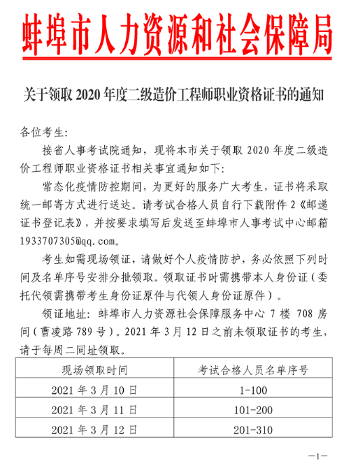 安徽蚌埠3.10-12領(lǐng)取2020年二級造價(jià)師執業(yè)資格證書(shū)