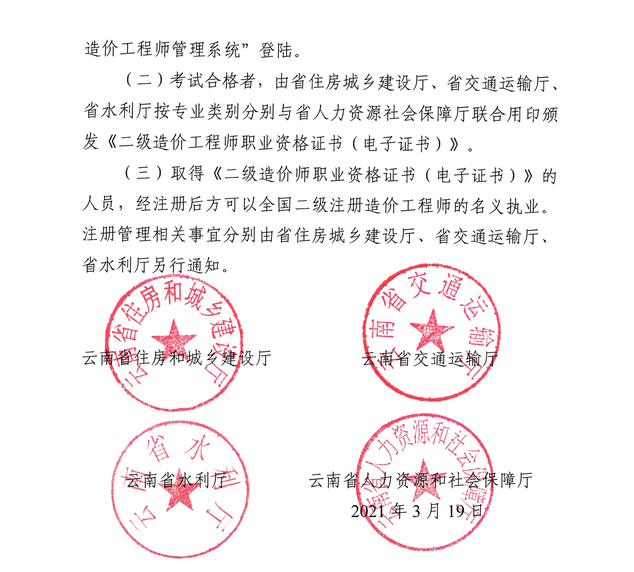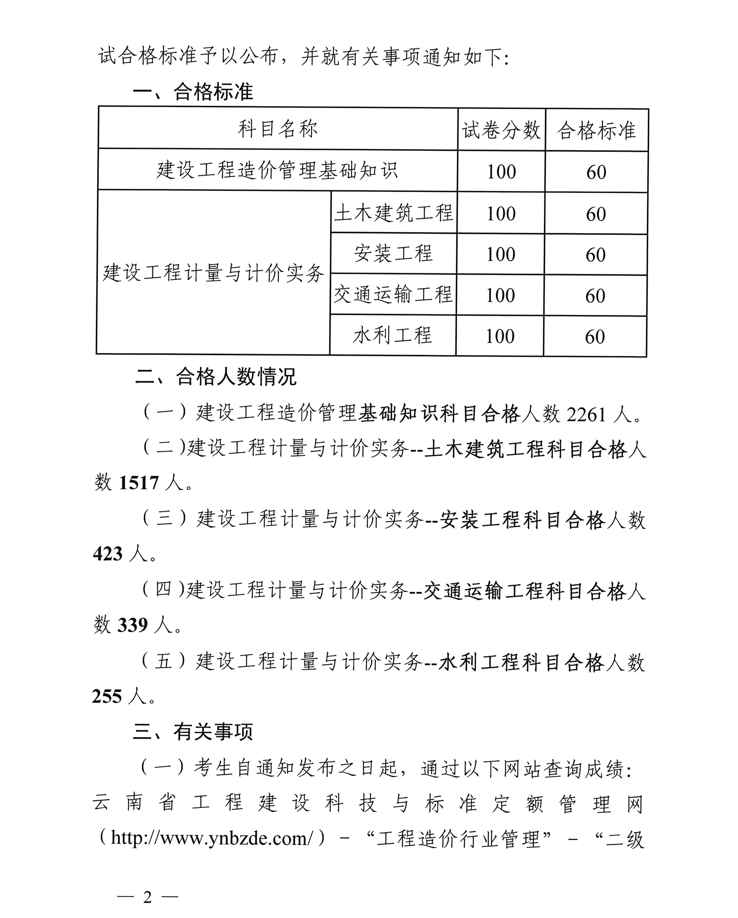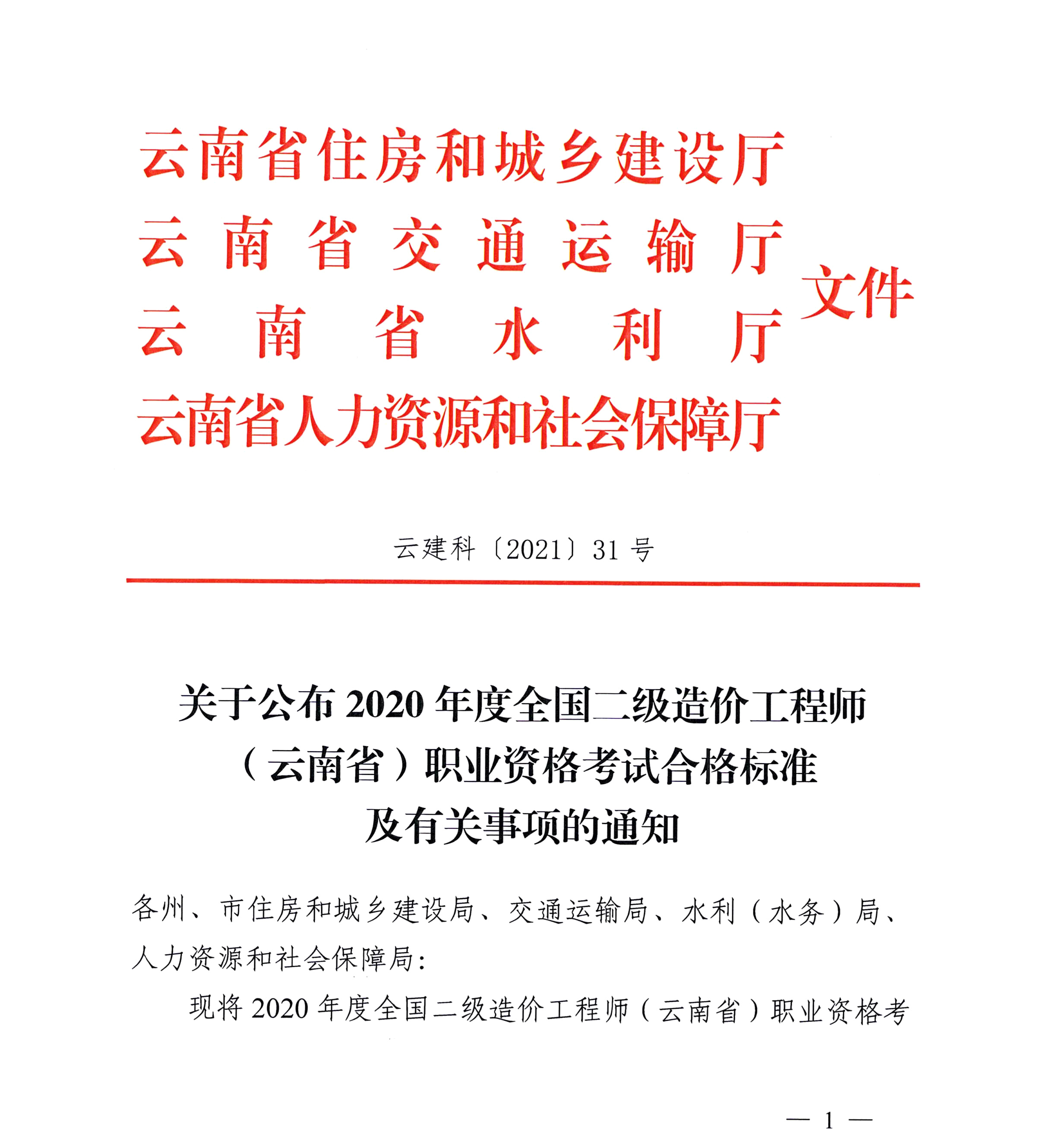關(guān)于公布2020年度全國二級造價(jià)工程師(云南省)職業(yè)資格考試合格標準及有關(guān)事項的通知