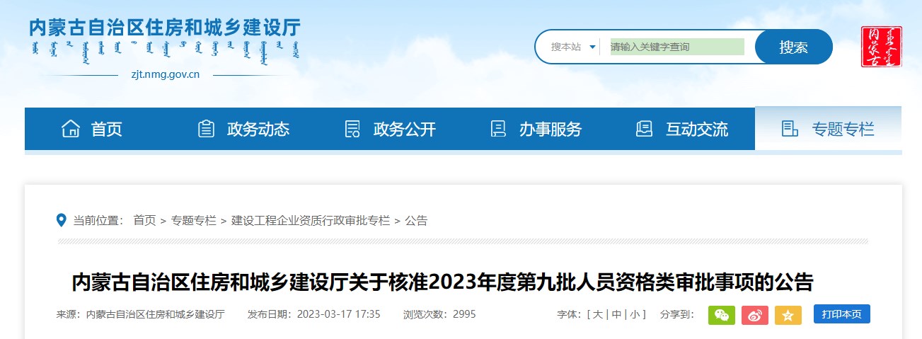 內蒙古自治區住房和城鄉建設廳關(guān)于核準2023年度第九批人員資格類(lèi)審批事項的公告