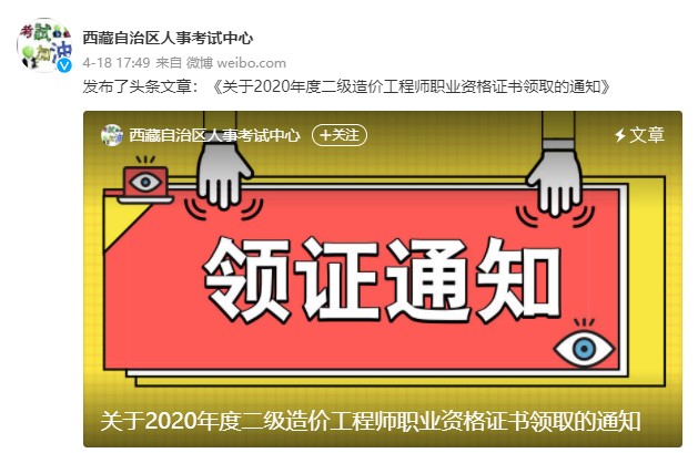 西藏關(guān)于2020年度二級造價(jià)工程師職業(yè)資格證書(shū)領(lǐng)取的通知