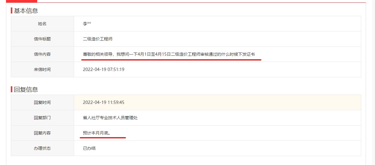 近日有同學(xué)向貴州省人力資源和社會(huì )保障廳咨詢(xún)了2021年二級造價(jià)師證書(shū)發(fā)放的時(shí)間,得到了官方回復。