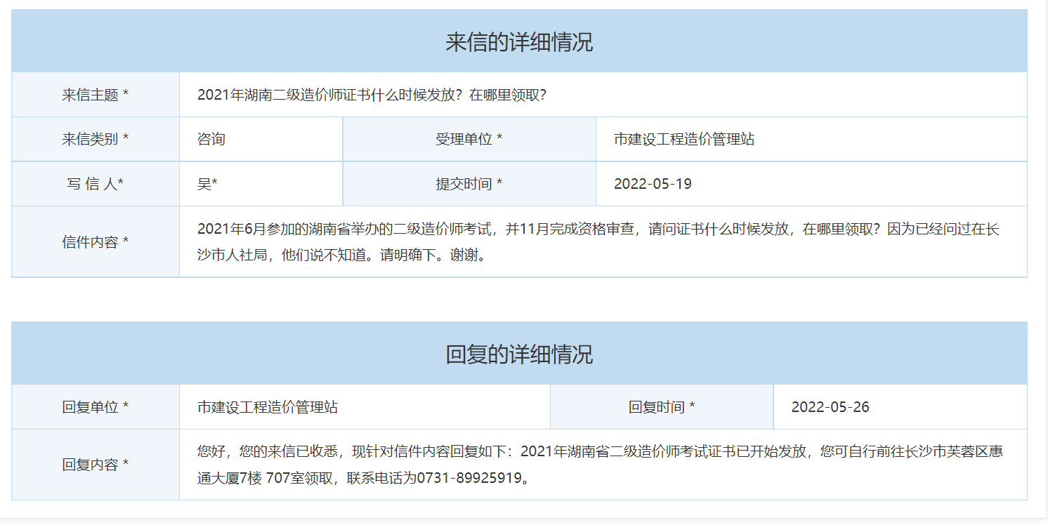 湖南省2021年二級造價(jià)師證書(shū)陸開(kāi)始領(lǐng)取,近日,有長(cháng)沙考生針對證書(shū)領(lǐng)取的問(wèn)題咨詢(xún)了長(cháng)沙住建局,一起來(lái)看官方回答。