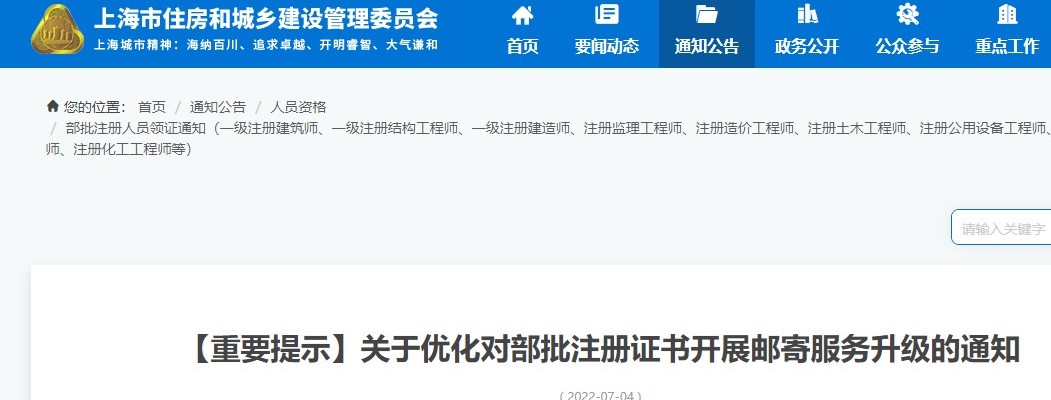 為降低新冠肺炎疫情傳播風(fēng)險,有效減少人員聚集,阻斷疫情傳播,上海市住房和城鄉建設管理委員會(huì )行政服務(wù)中心(以下簡(jiǎn)稱(chēng)市住房城鄉建設管理委行政服務(wù)中心)對部批注冊證書(shū)郵寄服務(wù)進(jìn)一步優(yōu)化完善?,F通知如下: