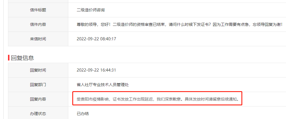 近日,貴州省有考生就二級造價(jià)師證書(shū)發(fā)放的問(wèn)題向貴州省人社廳進(jìn)行提問(wèn),并收到了官方回復,具體情況如下: