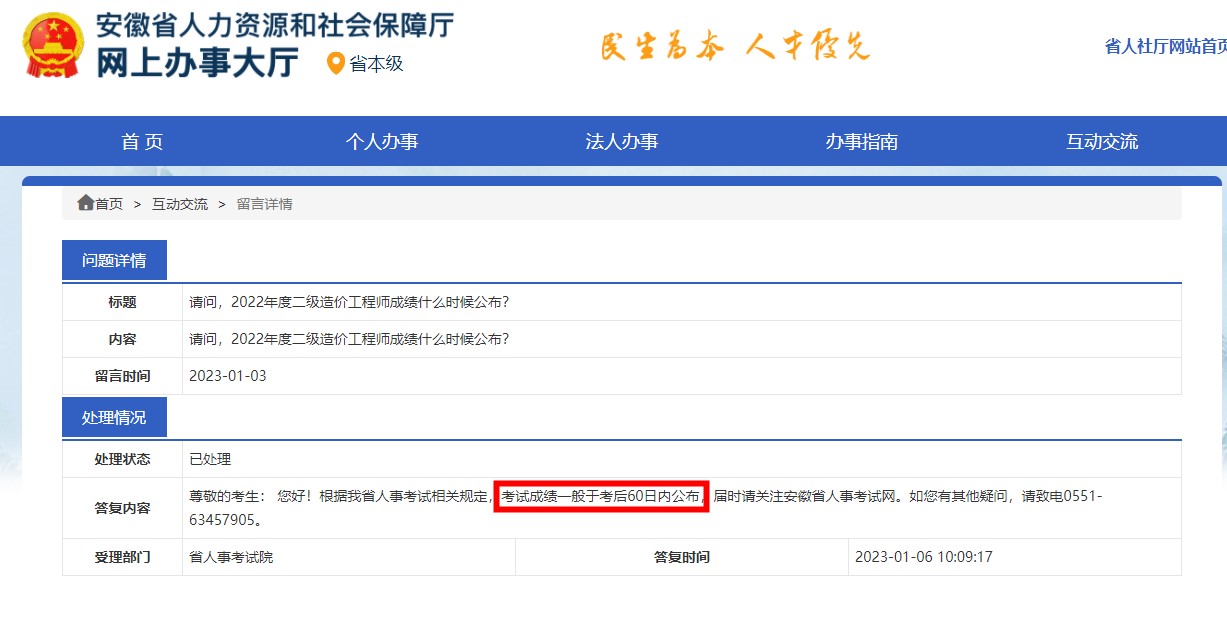 安徽考試院回復:2022年二級造價(jià)師考試成績(jì)一般于考后60日內公布