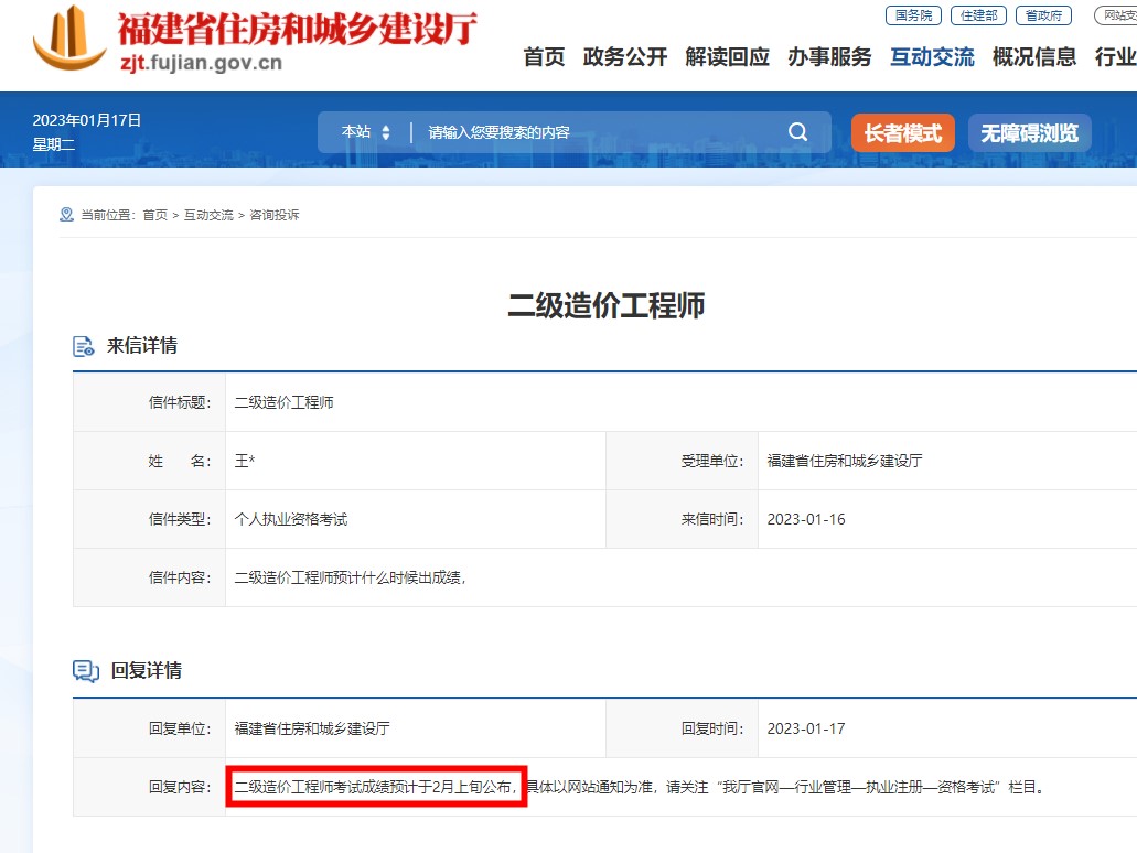 福建省2022年首次進(jìn)行了二級造價(jià)師考試,同學(xué)們都很關(guān)心考試成績(jì)。近日,有考生就成績(jì)公布時(shí)間向福建省住建廳進(jìn)行提問(wèn),并獲得了官方回復。