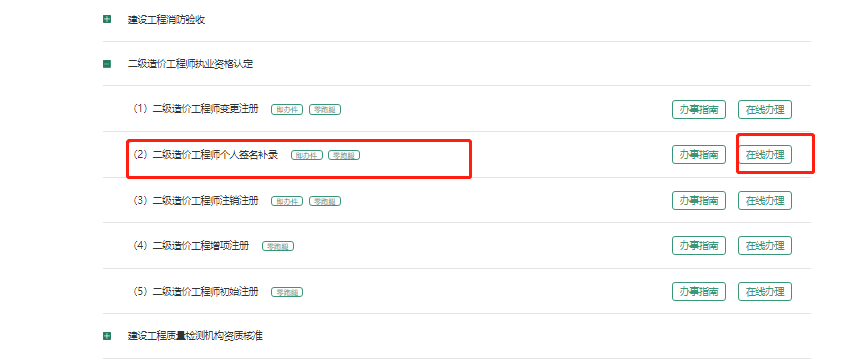 (4)選擇“個(gè)人簽名補錄”,點(diǎn)擊“在線(xiàn)辦理”