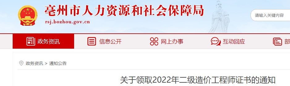 安徽亳州關(guān)于領(lǐng)取2022年二級造價(jià)工程師證書(shū)的通知