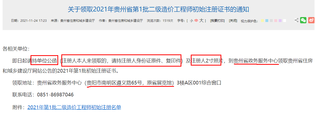 即日起請持單位公函(注冊人本人來(lái)領(lǐng)取的,請持注冊人身份證原件、復印件)及注冊人2寸照片,到貴州省政務(wù)服務(wù)中心領(lǐng)取貴州省住房和城鄉建設廳網(wǎng)站公告的2021年第1批初始注冊證書(shū)。