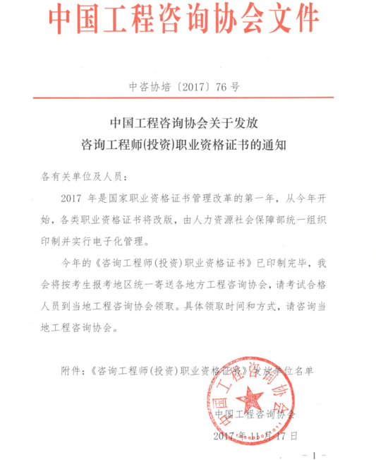 中國工程咨詢(xún)協(xié)會(huì )關(guān)于發(fā)放咨詢(xún)工程師(投資)職業(yè)資格證書(shū)通知